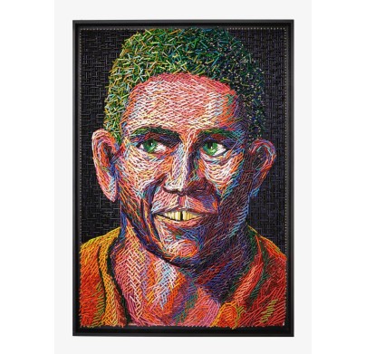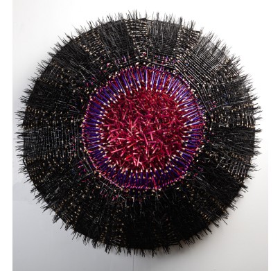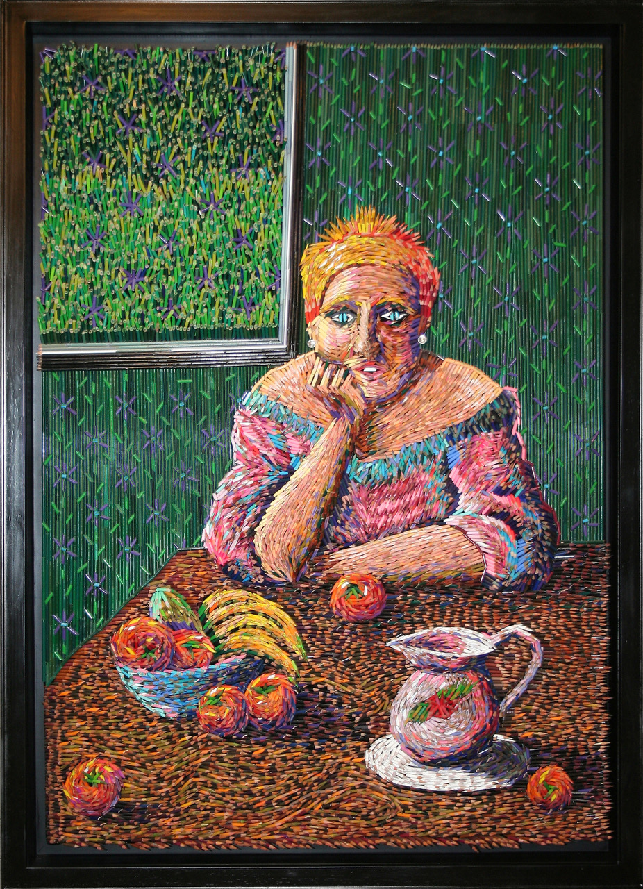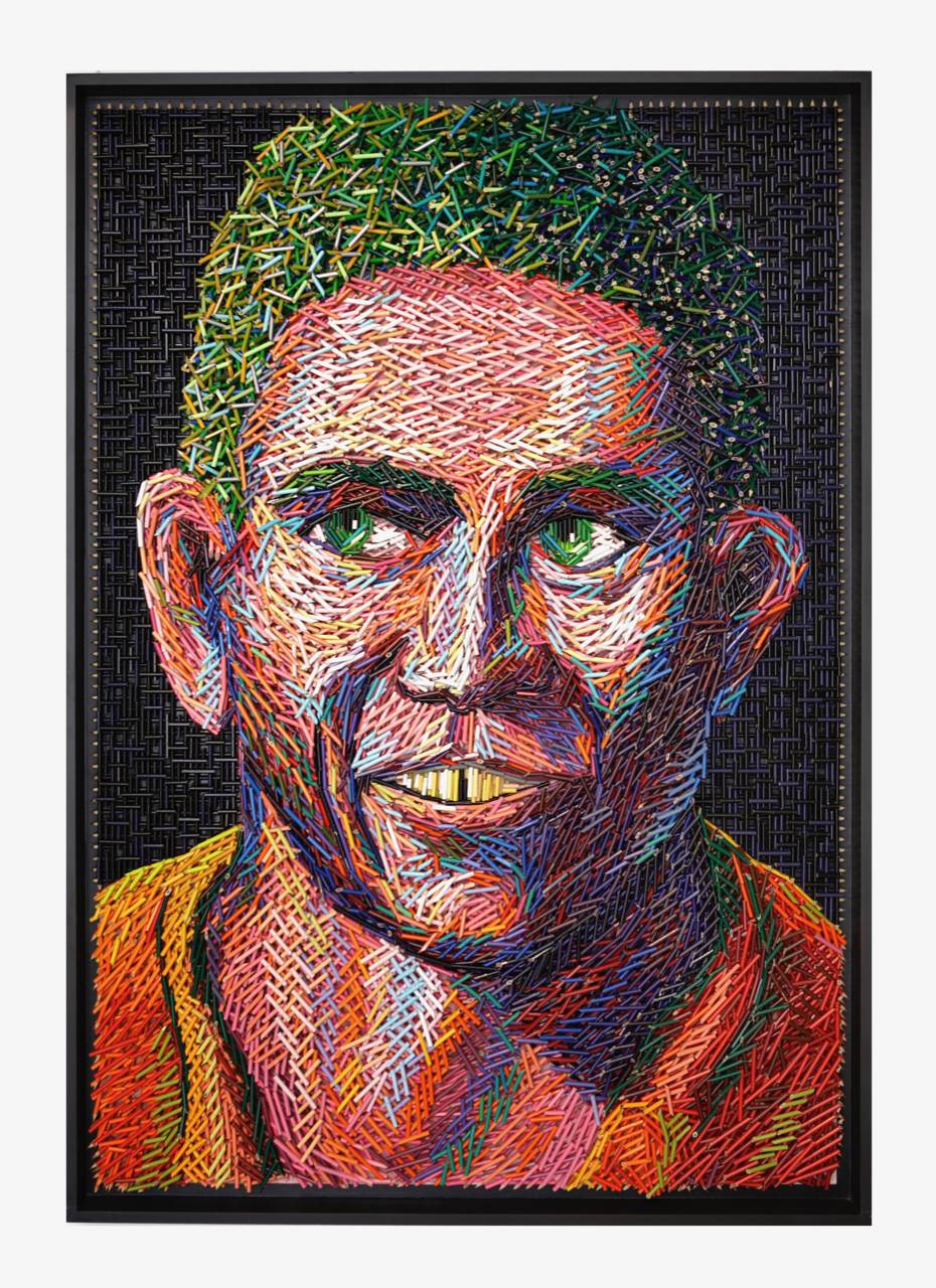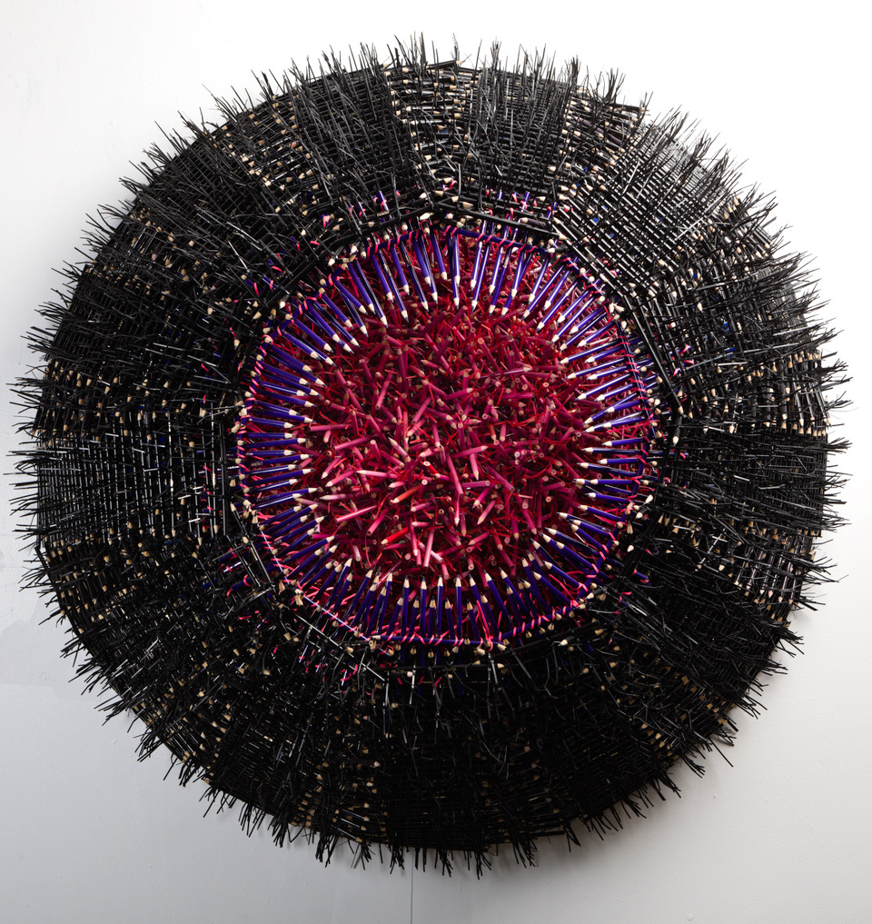 Uribe creates meticulously constructed sculptures using everyday and industrial objects such as bullet shells, colored pencils, shoelaces, electrical wires, pins, books, and discarded materials. Rather than modeling or carving, he builds his works through repetitive weaving, assembling, and layering processes that emphasize structure, rhythm, and form.