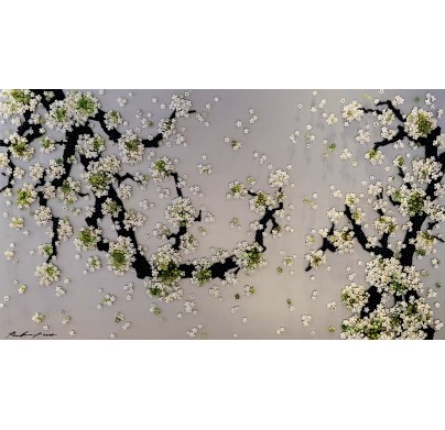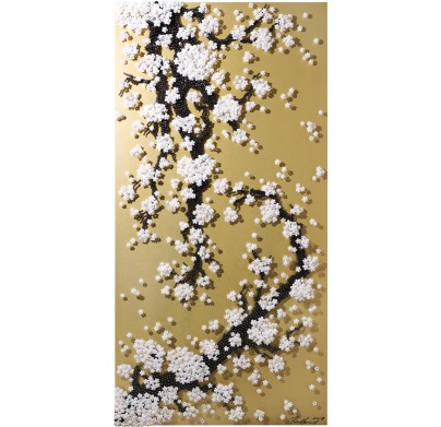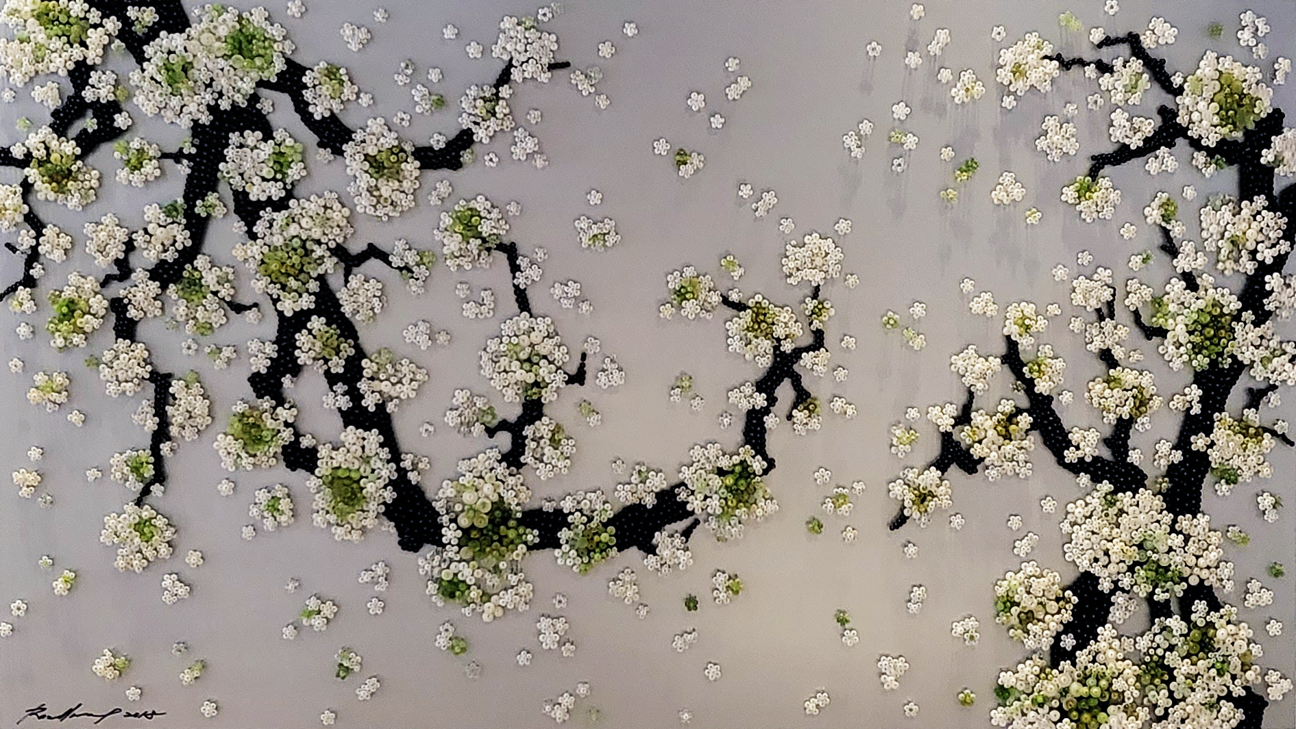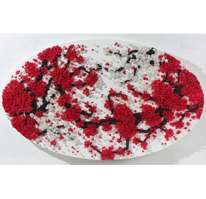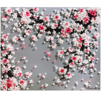 Known for her ingenious use of materials to build up contemporary installations, Ran Hwang uses buttons, beads, pins, and threads on wood panels to form images of falling blossoms, vases, Buddhas, and birds. Hwang's installations have also taken on more current themes, exploring the fashion industry and female identities in popular culture. Drawing from Eastern philosophies, Hwang's method is a meditative ritual in which she first projects an outline onto the wall, then traces its contour and painstakingly fills in the image with her materials.