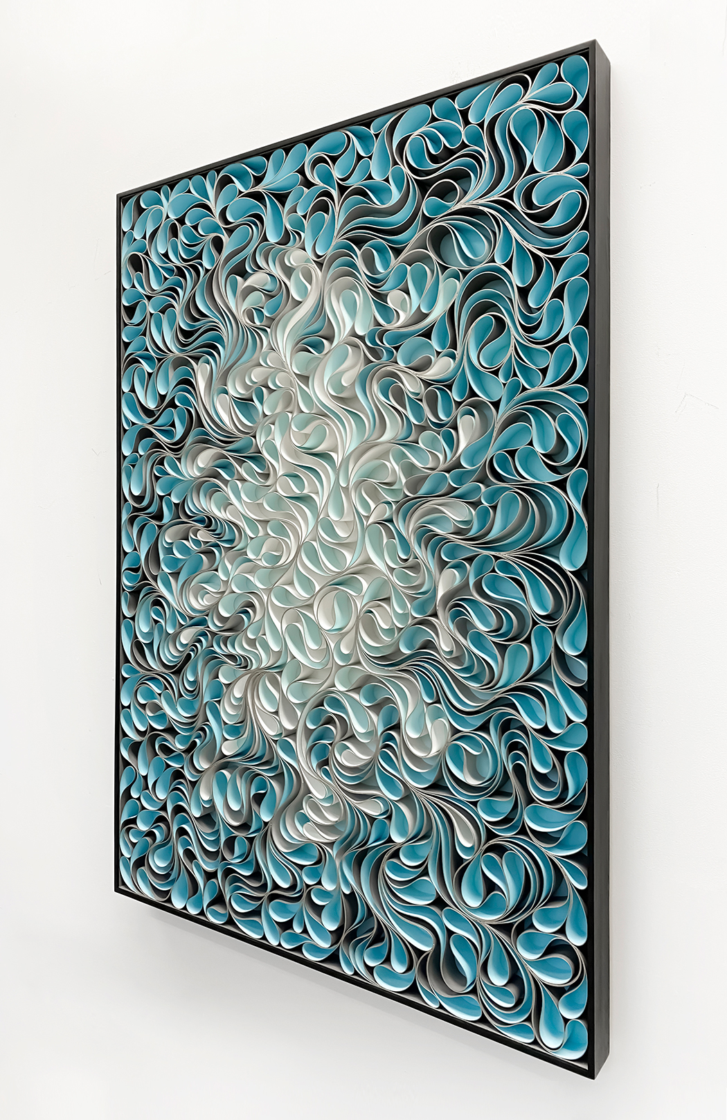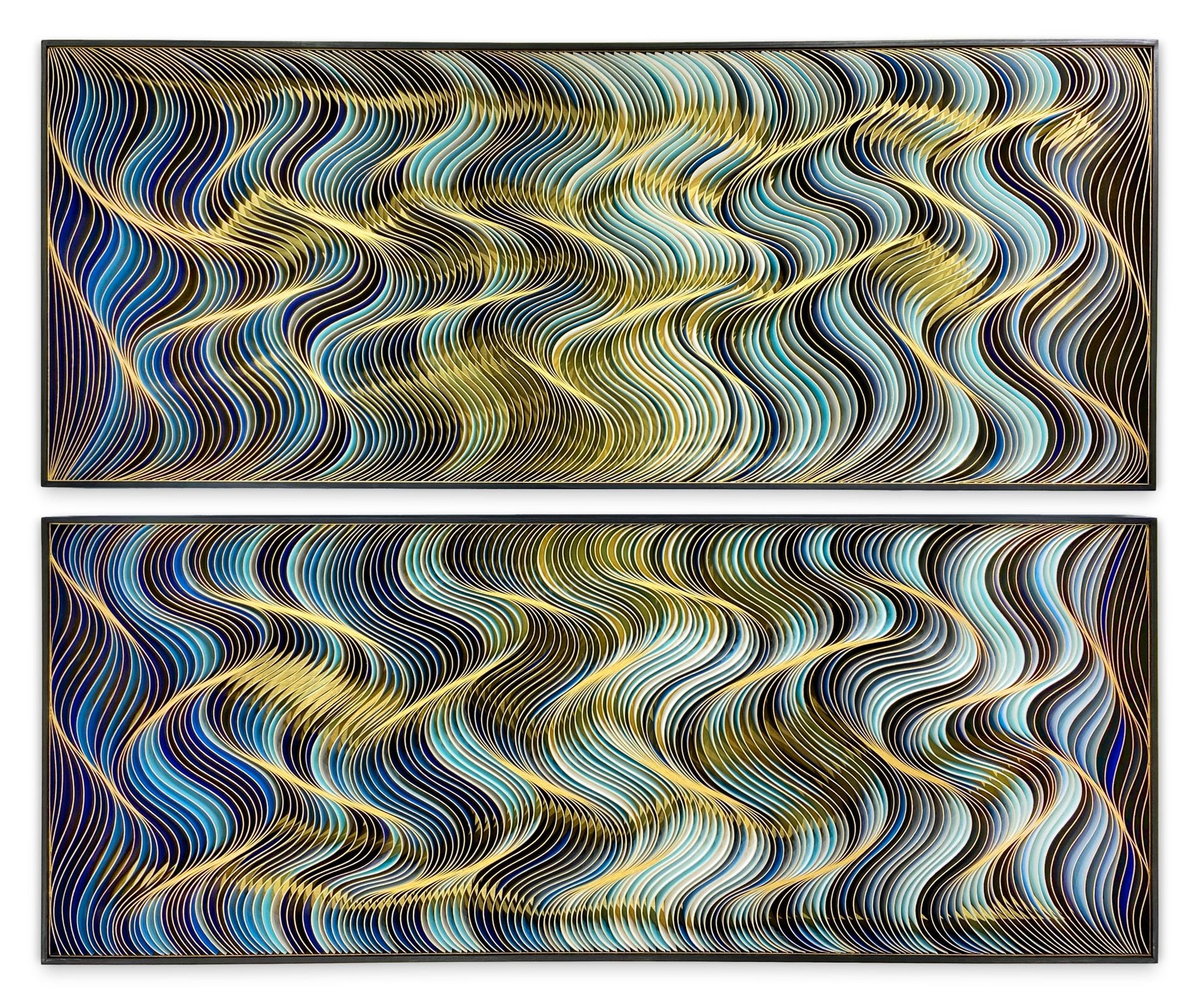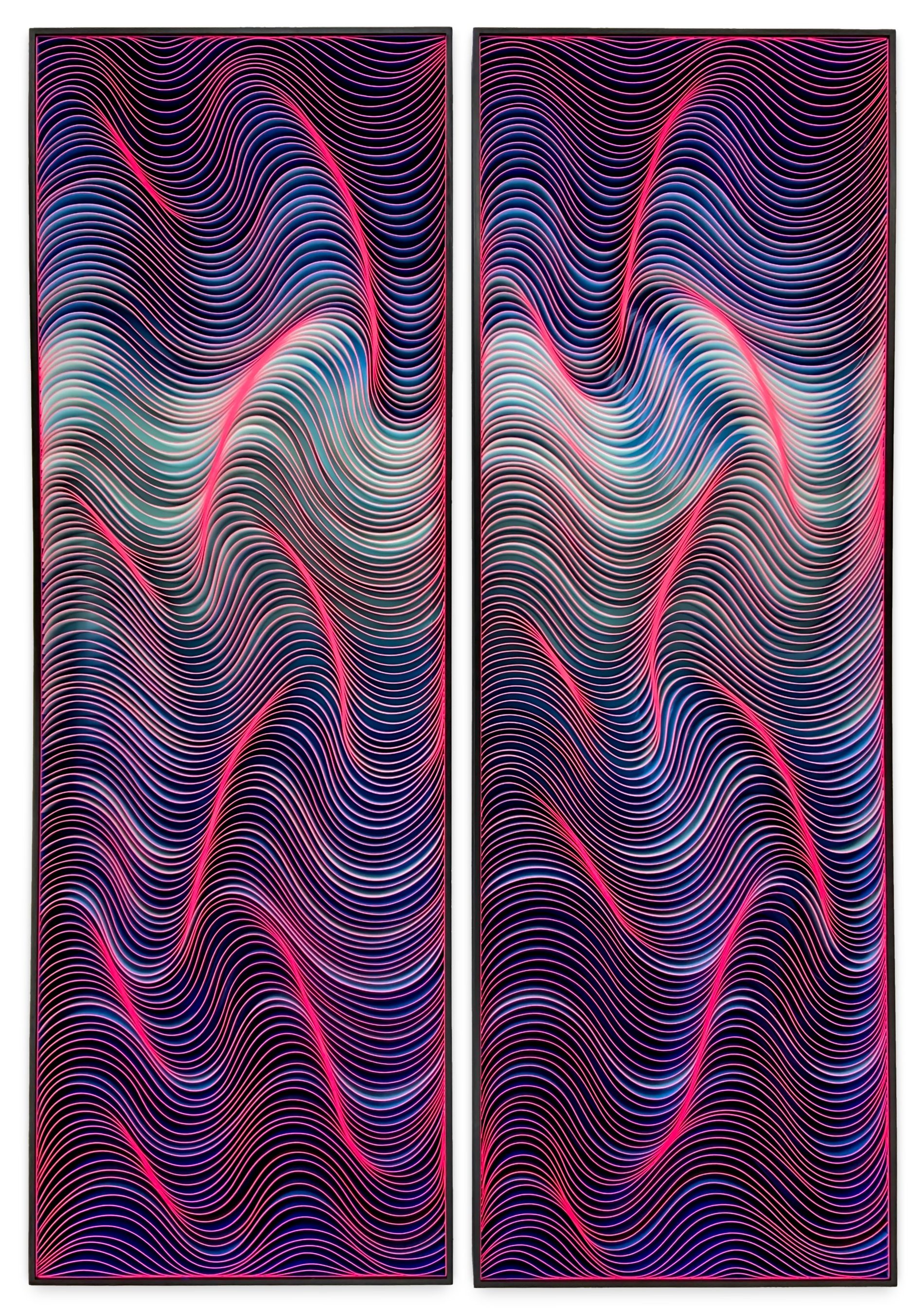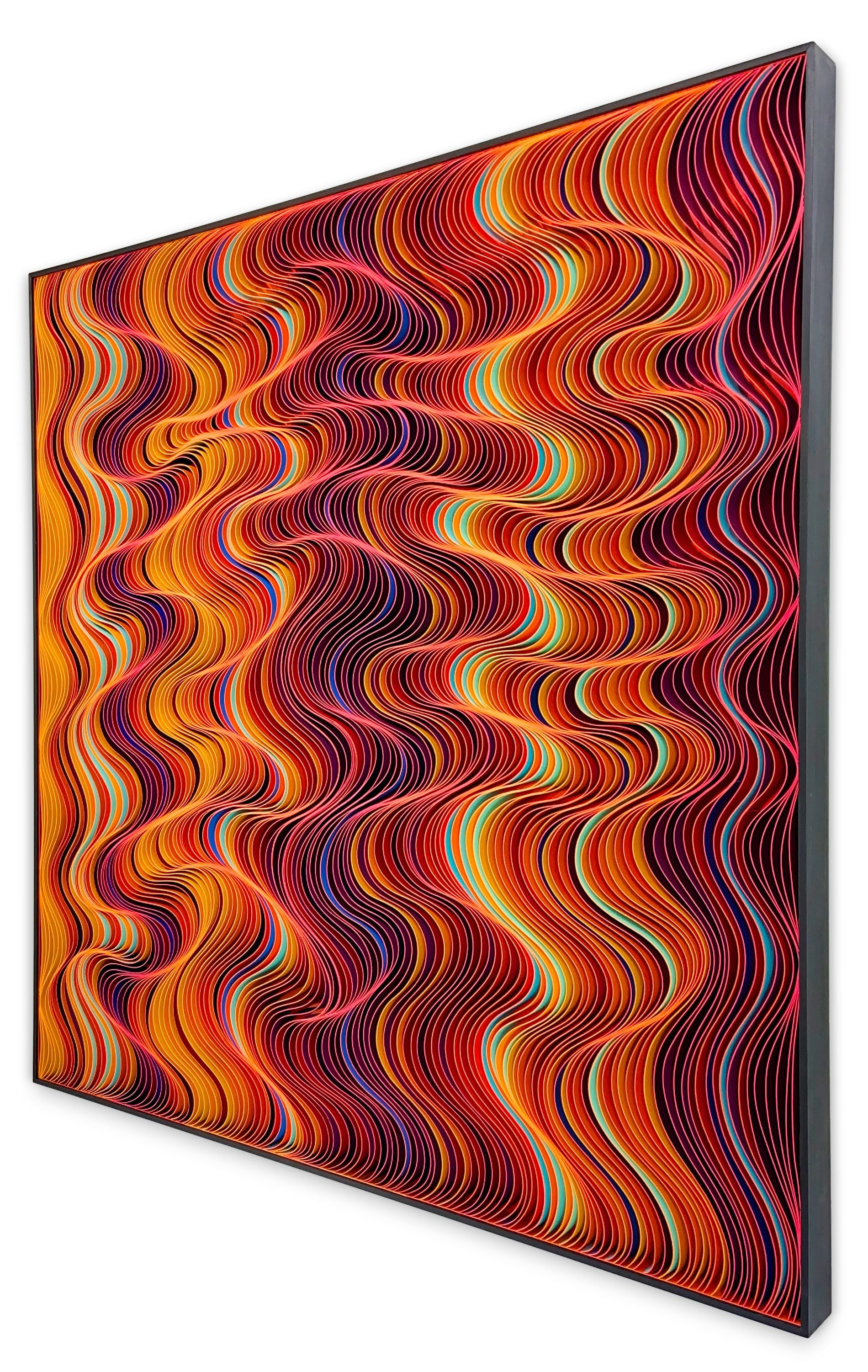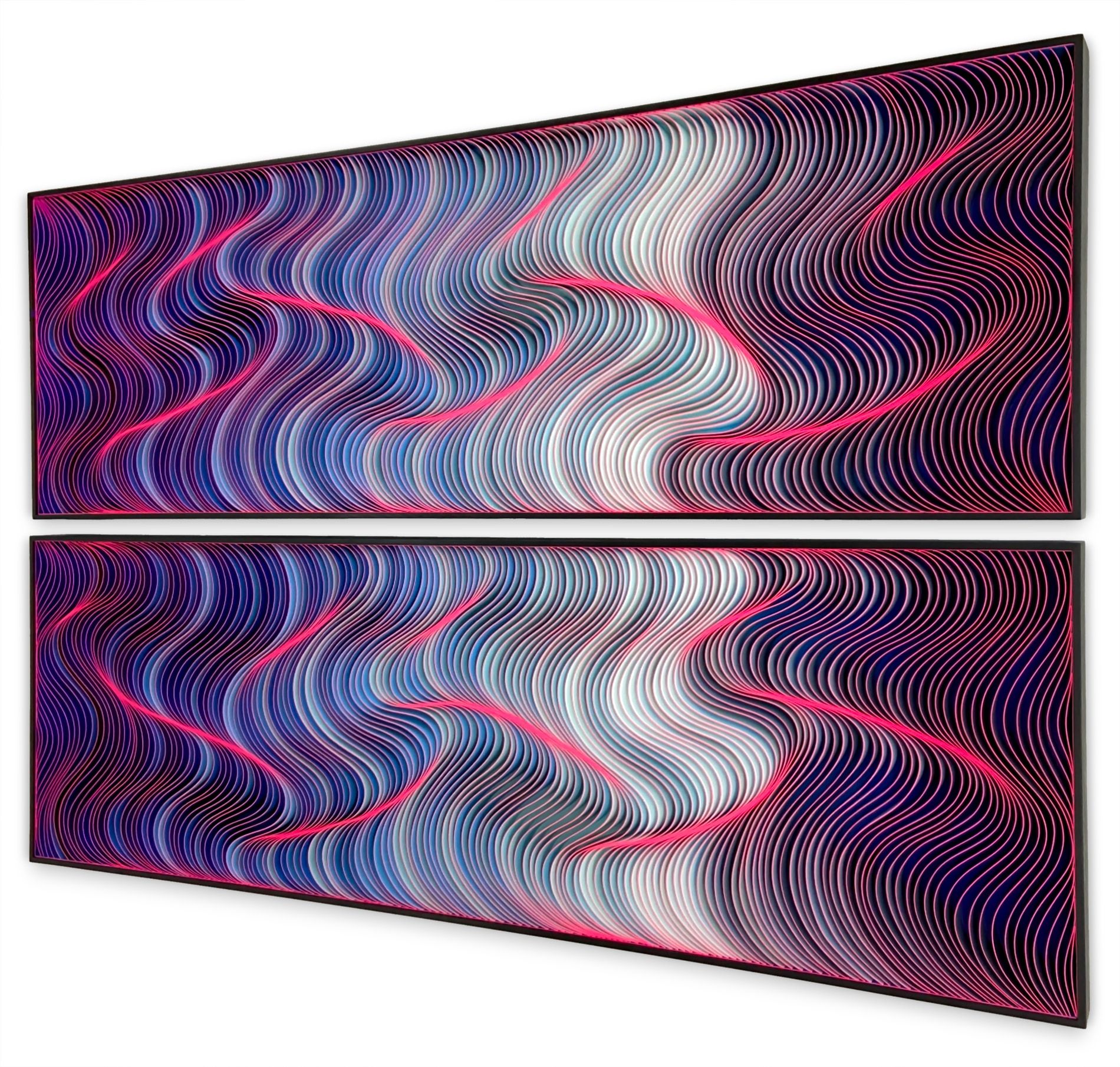 The cut edge of the canvas creates an elevated line drawing and when seen at an angle, fields of color emerge as your perspective to the piece changes. Each length of painted canvas is bonded to itself and to the background creating a rigid structure within the frame. The hue of the painted canvas reflects on the background creating a spectrum of color. By using reflected light, pigment and structure they multiply the hues and tones within each sculpture.