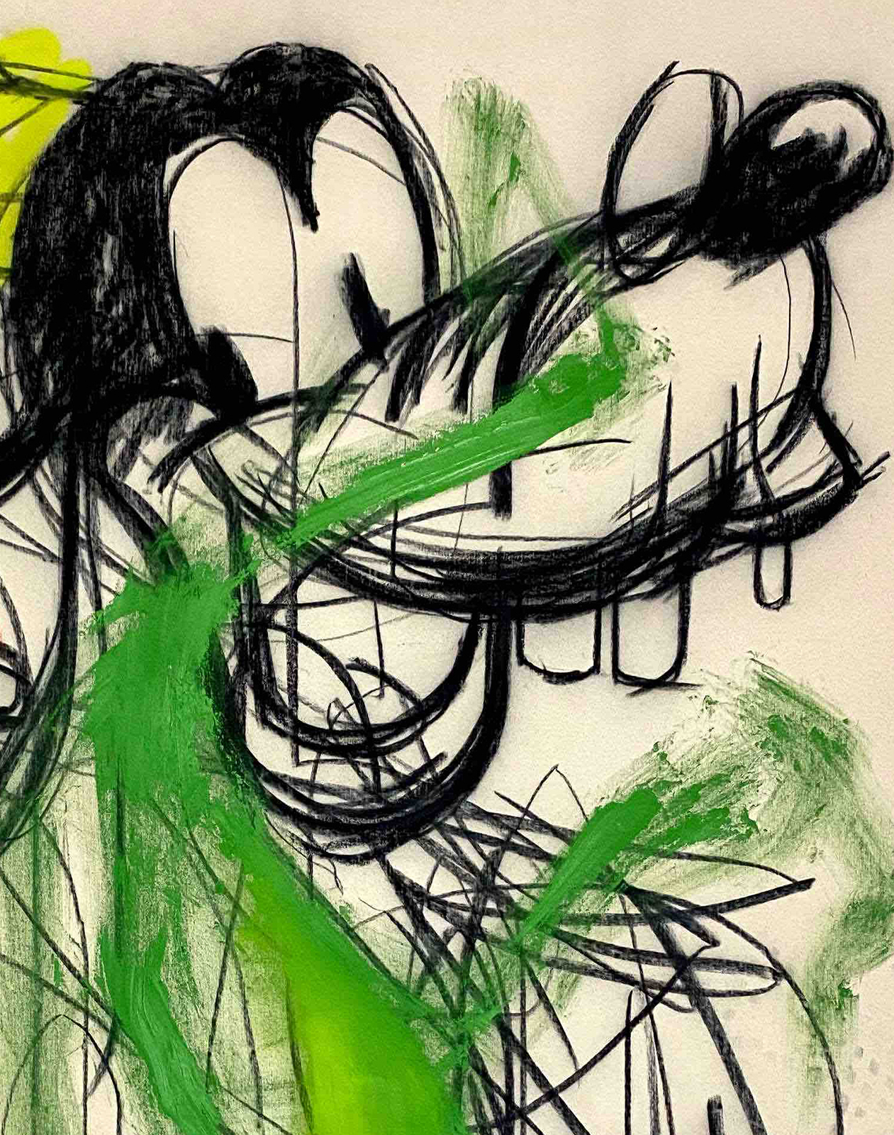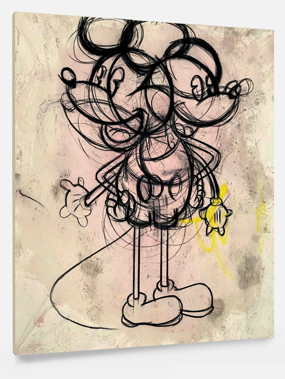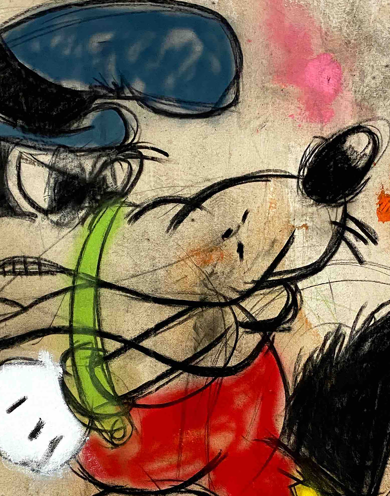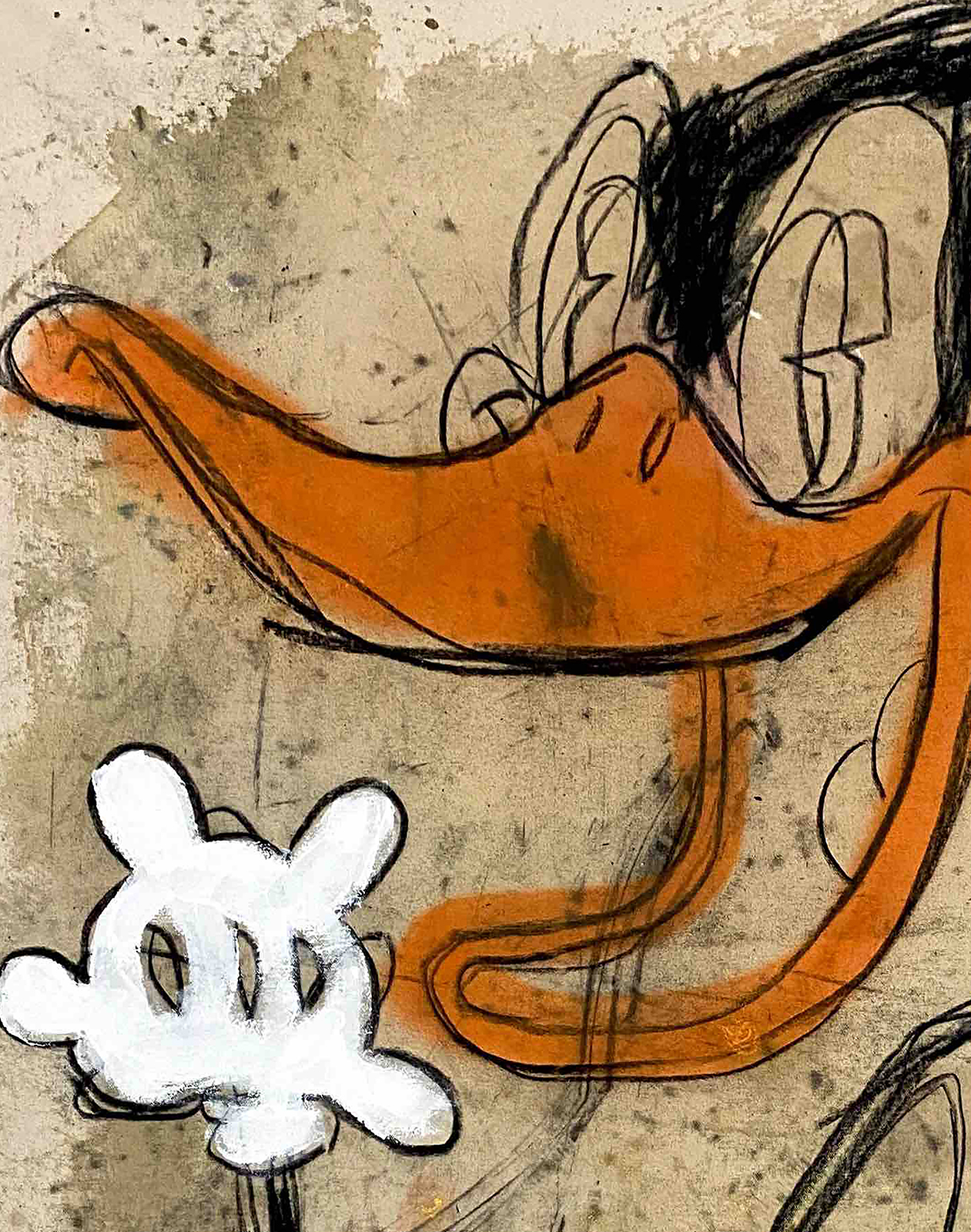 Passionate about animation and drawing, he began to study animation at Surrey Institute of Art and Design. He soon realised that the traditional manner of creating cartoons was shifting towards the digital medium, and decided to study fine arts instead. The result is unparalleled: with his cartoon characters that resemble sketches of cartoon drawings, George Morton-Clark provokes a range of emotions and suddenly thrusts us back into childhood. Here, Garfield, Pluto, and the Pink Panther are depicted with the same features as in the cartoons, but they have a new vitality.