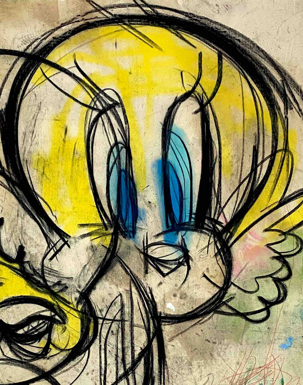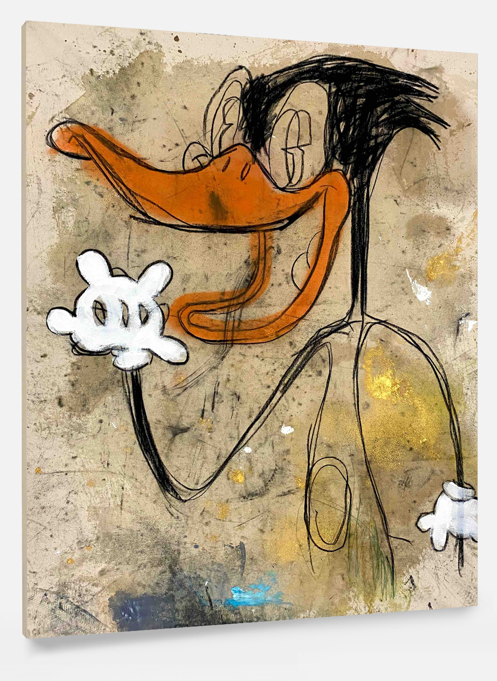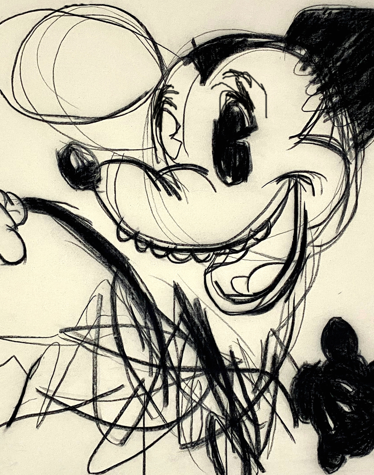 Passionate about animation and drawing, he began to study animation at Surrey Institute of Art and Design. He soon realised that the traditional manner of creating cartoons was shifting towards the digital medium, and decided to study fine arts instead. The result is unparalleled: with his cartoon characters that resemble sketches of cartoon drawings, George Morton-Clark provokes a range of emotions and suddenly thrusts us back into childhood. Here, Garfield, Pluto, and the Pink Panther are depicted with the same features as in the cartoons, but they have a new vitality.