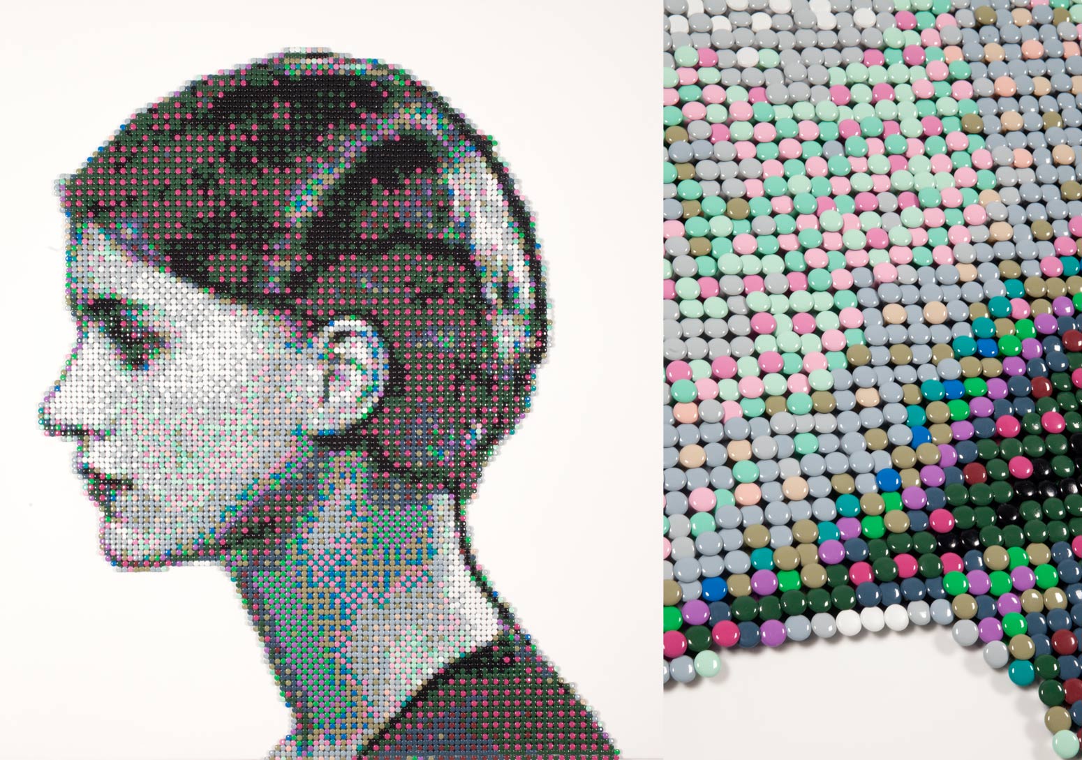 Black combines his natural craft skills with a deep appreciation for materials—many of which are recognisable everyday objects—to create striking portraits and abstract works. Employing a meticulous technique of hand-painting and altering each tiny object, he achieves gentle lines and shading that give life to his subjects. Black has pioneered an elaborate new form of pixelation, embedding subtle implications and layers of meaning within his images.