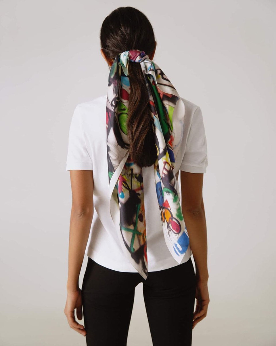 Together with Taher Jaoui, OLIZ designers selected artworks that are representative of the various series in his body of work: colored compositions, monochromatic compositions, mathematic signs. Three exclusive silk scarves were created as a result: “Love is a big expense”, “My dreaming about you” and “Hold your horses”. Composed of 100% silk, these are made using only natural Italian fabrics and environmentally friendly dyes and they come in 3 different sizes (100 x 100 cm, 65 x 186 cm and 65 x 65 cm).