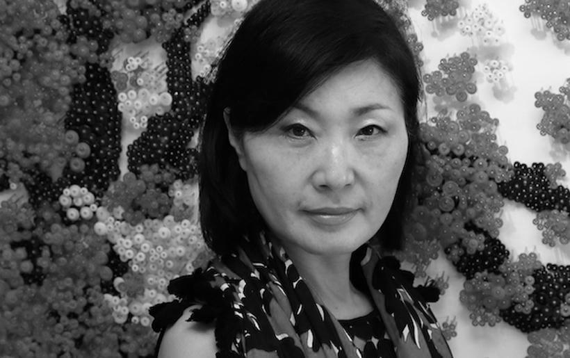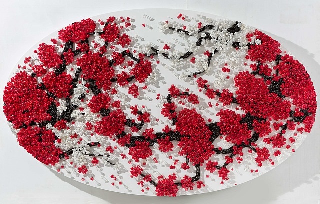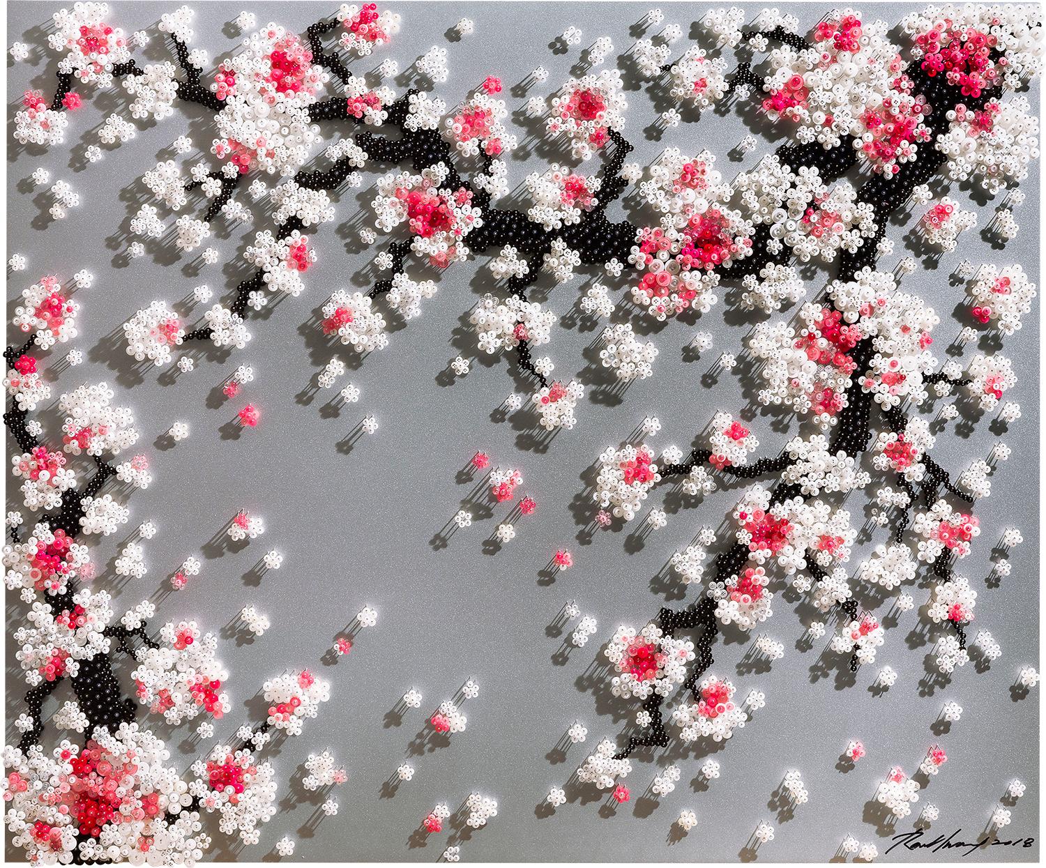 Known for her ingenious use of materials to build up contemporary installations, Ran Hwang uses buttons, beads, pins, and threads on wood panels to form images of falling blossoms, vases, Buddhas, and birds. Hwang's installations have also taken on more current themes, exploring the fashion industry and female identities in popular culture. Drawing from Eastern philosophies, Hwang's method is a meditative ritual in which she first projects an outline onto the wall, then traces its contour and painstakingly fills in the image with her materials.
