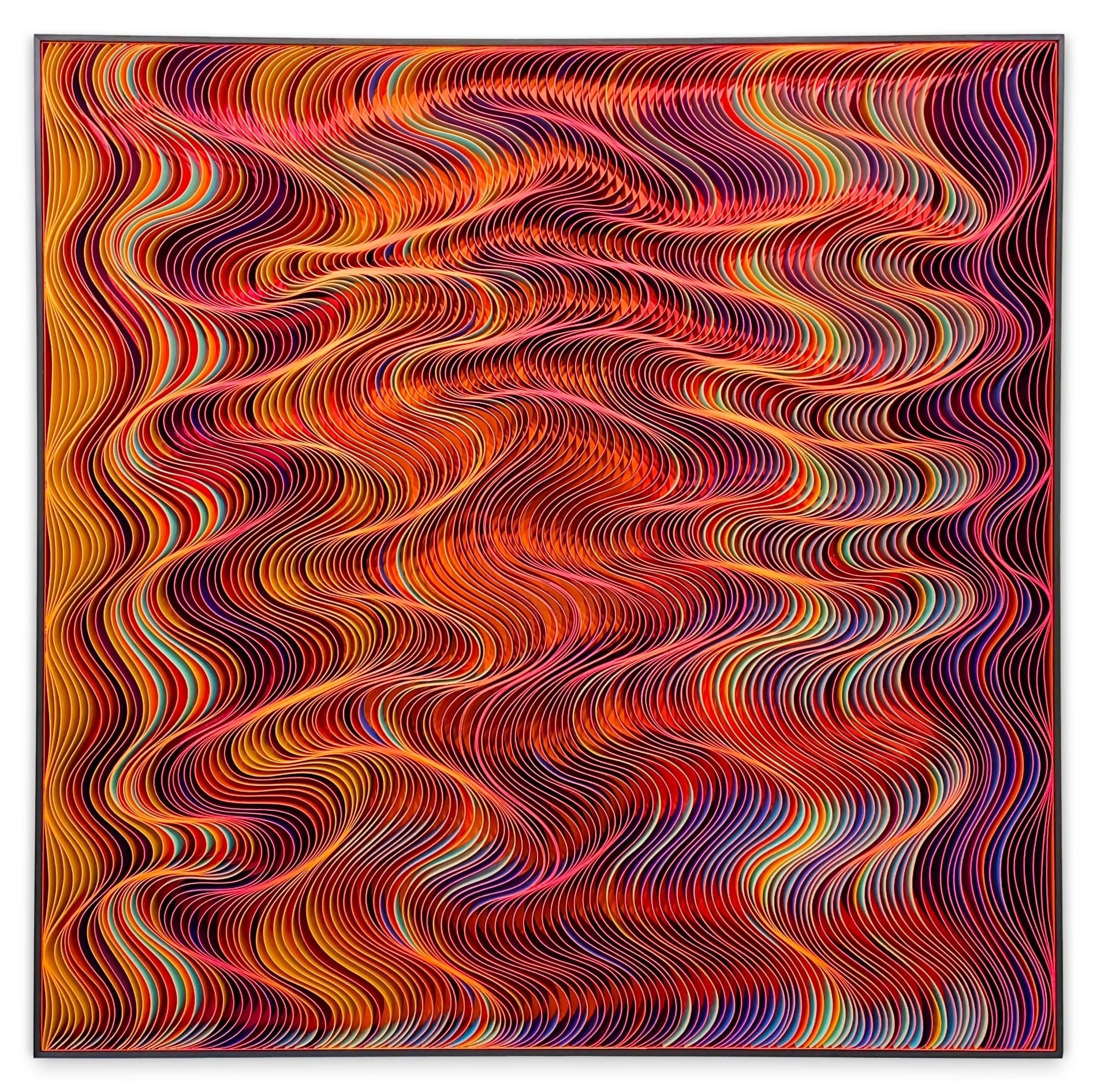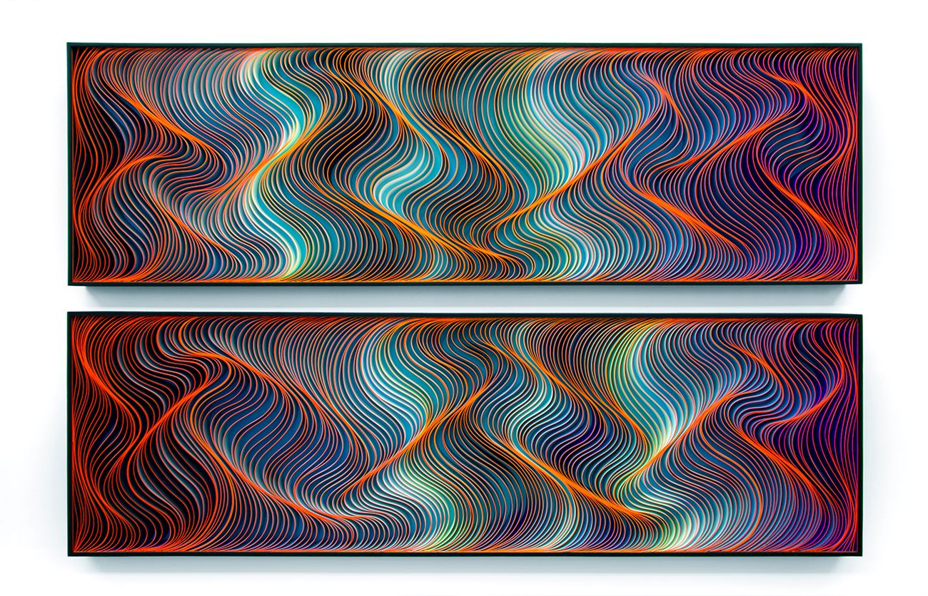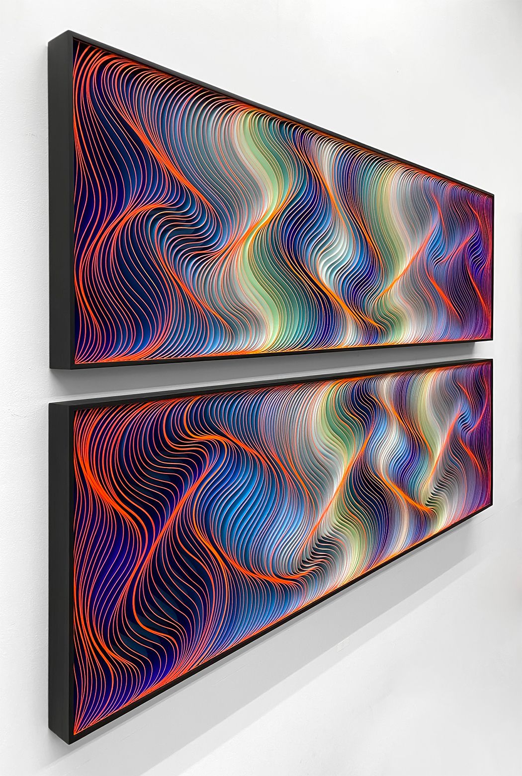 The cut edge of the canvas creates an elevated line drawing and when seen at an angle, fields of color emerge as your perspective to the piece changes. Each length of painted canvas is bonded to itself and to the background creating a rigid structure within the frame. The hue of the painted canvas reflects on the background creating a spectrum of color. By using reflected light, pigment and structure they multiply the hues and tones within each sculpture.