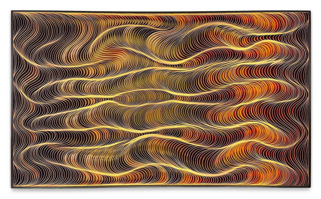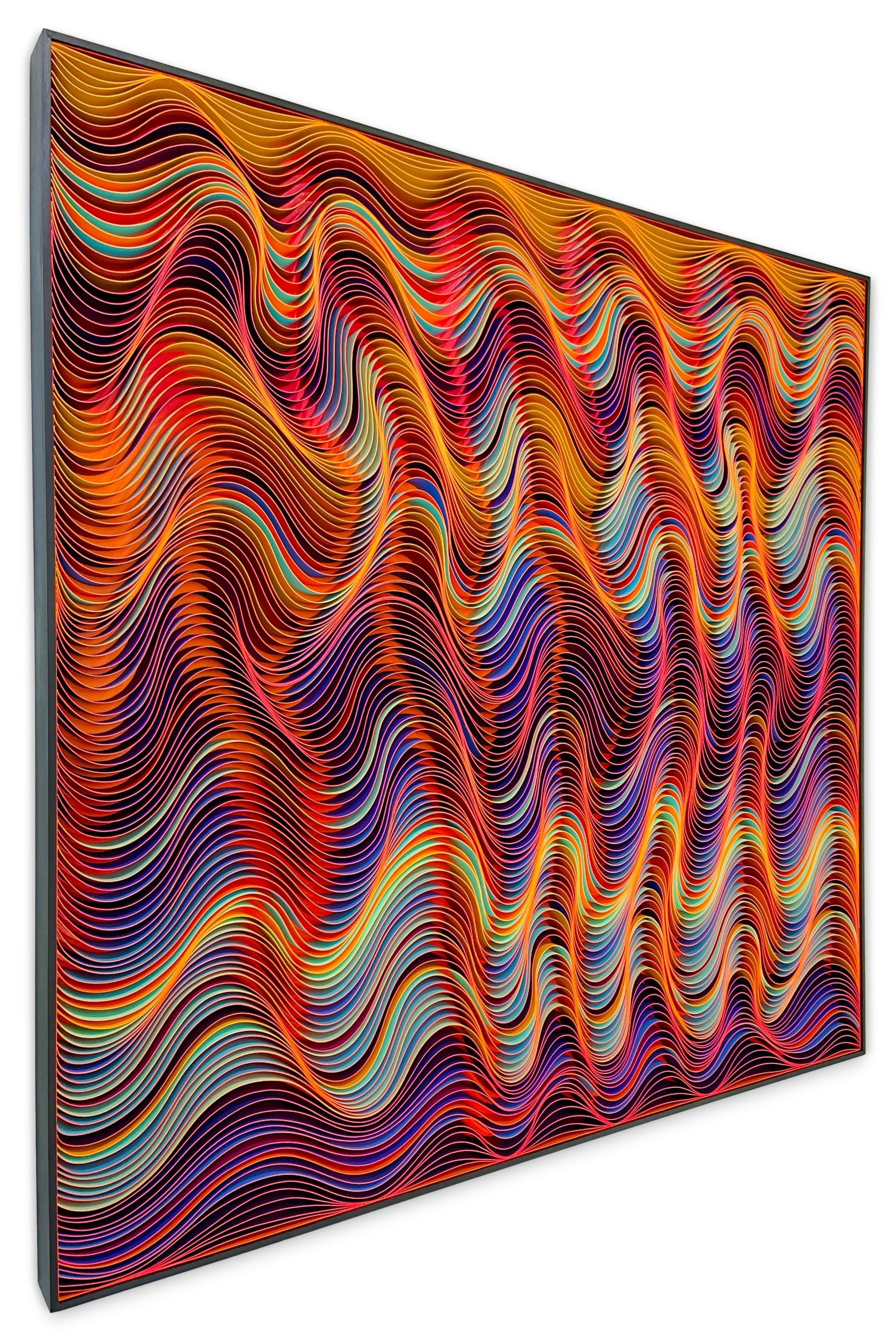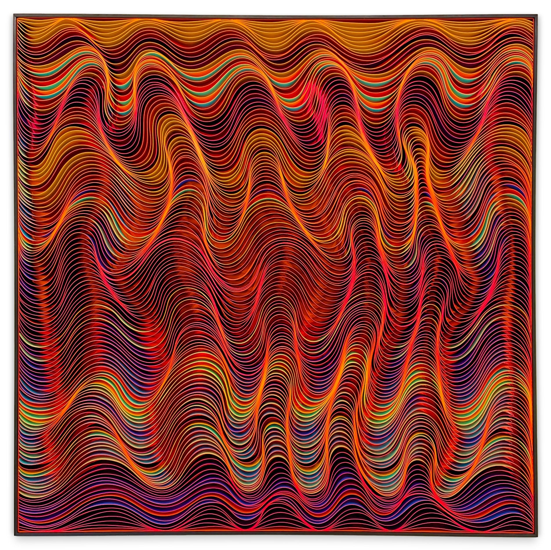 The cut edge of the canvas creates an elevated line drawing and when seen at an angle, fields of color emerge as your perspective to the piece changes. Each length of painted canvas is bonded to itself and to the background creating a rigid structure within the frame. The hue of the painted canvas reflects on the background creating a spectrum of color. By using reflected light, pigment and structure they multiply the hues and tones within each sculpture.