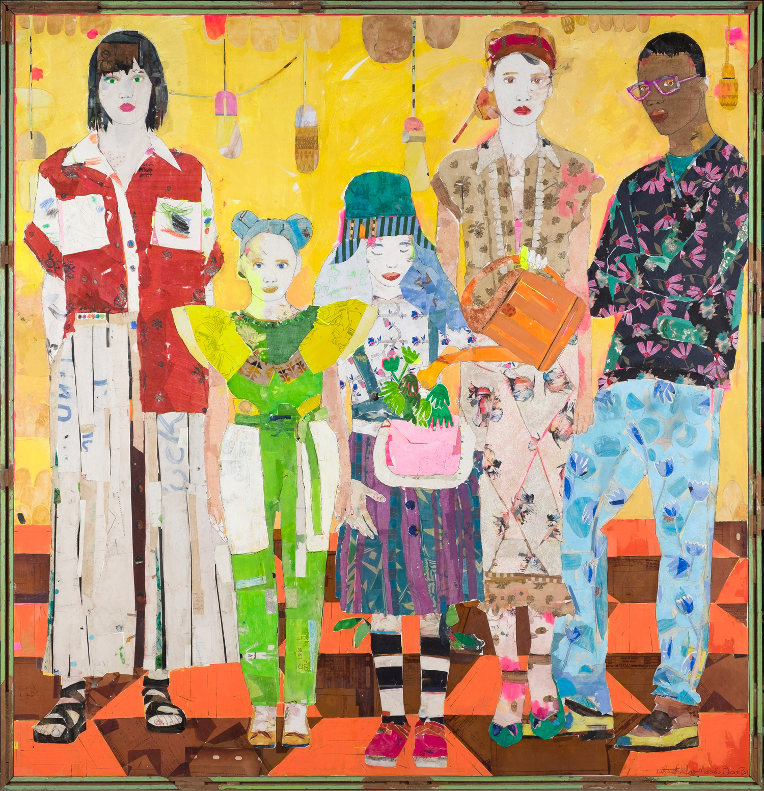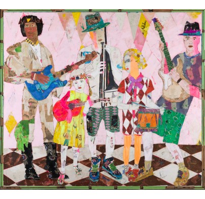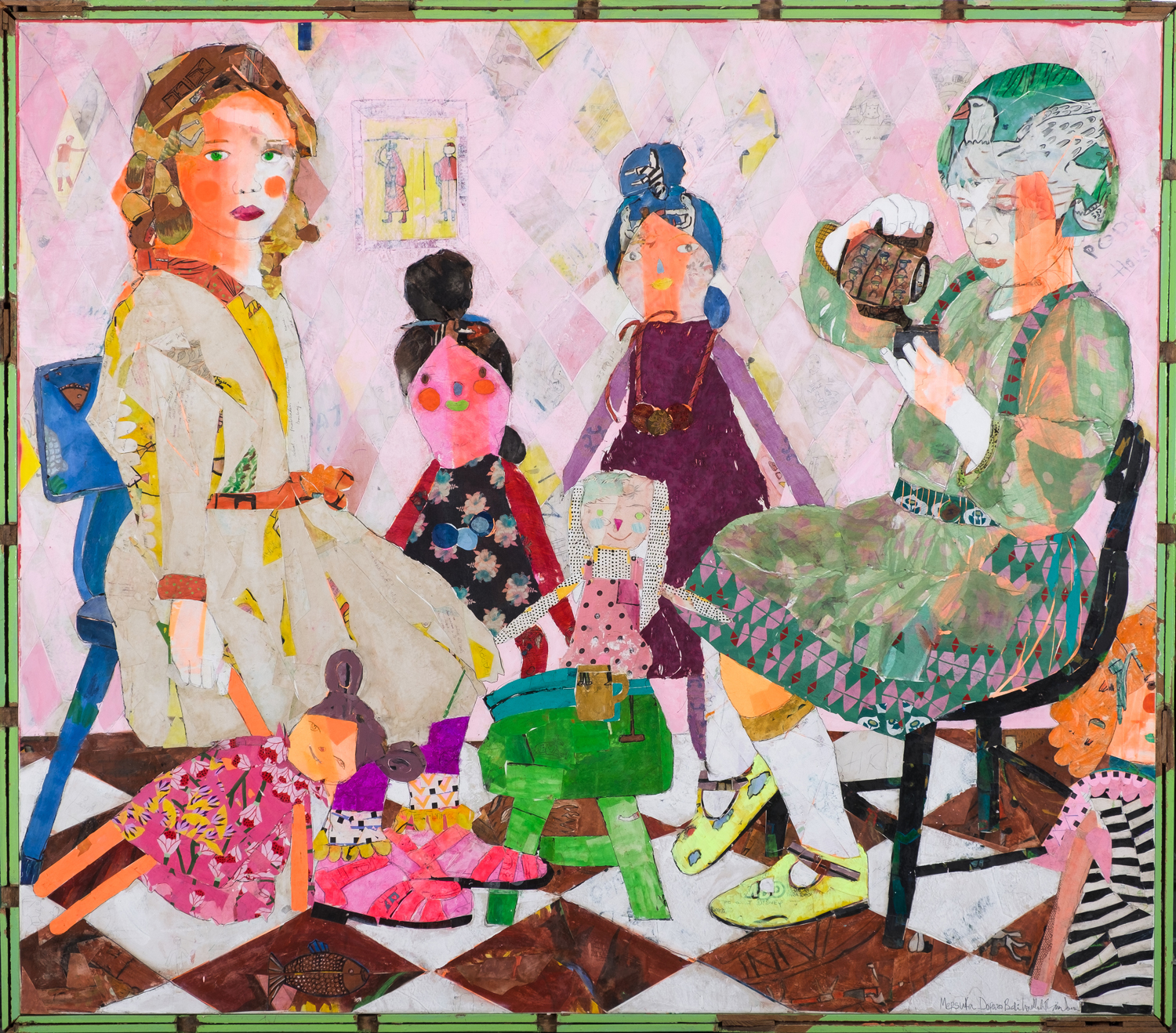 A mother of six, Spanish artist Mersuka Dopazo makes monumental fabric collage paintings in vibrant colors. She began working in textiles after a trip to Benares, India, where she was inspired by women washing their saris in the river and laying them out to dry. She returns regularly to India to teach schoolchildren art, and has incorporated 1950s-era drawings from local kids into her works, like little Easter eggs hidden within the larger tableaux. She now lives and works in Bali, Indonesia.