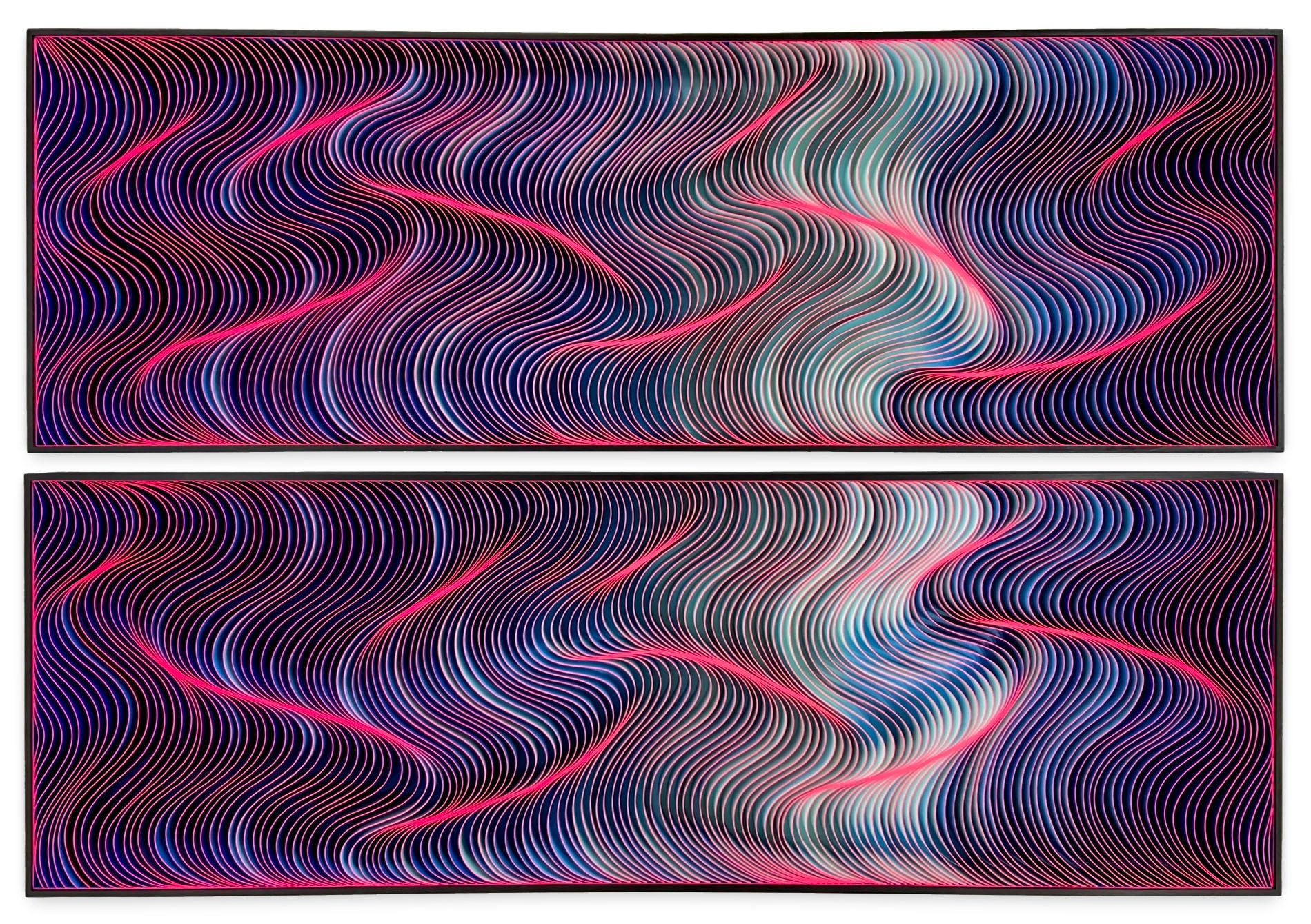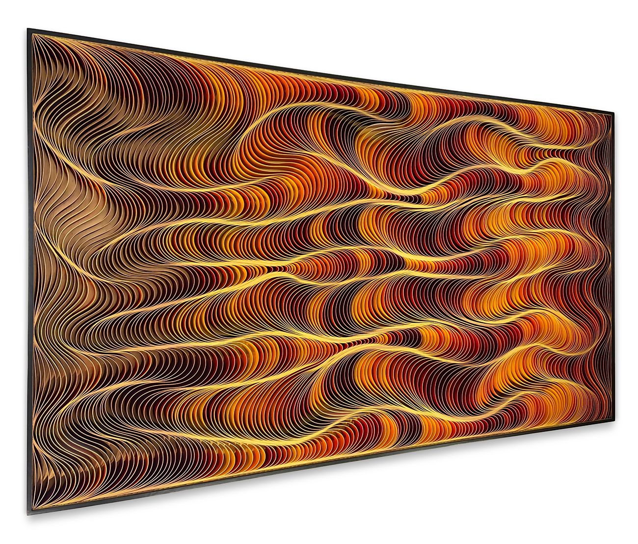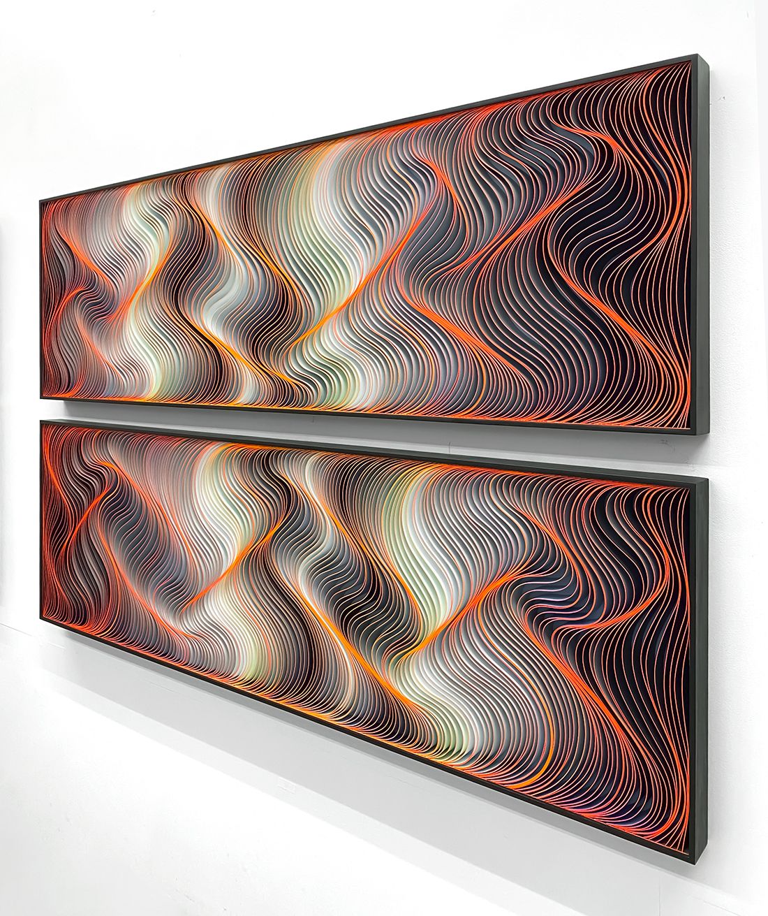 The cut edge of the canvas creates an elevated line drawing and when seen at an angle, fields of color emerge as your perspective to the piece changes. Each length of painted canvas is bonded to itself and to the background creating a rigid structure within the frame. The hue of the painted canvas reflects on the background creating a spectrum of color. By using reflected light, pigment and structure they multiply the hues and tones within each sculpture.