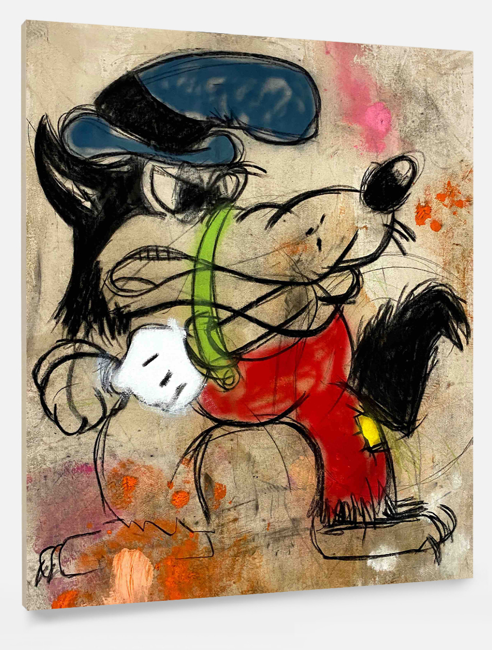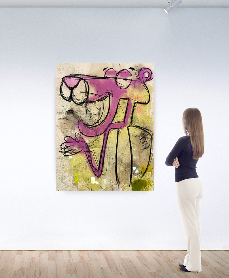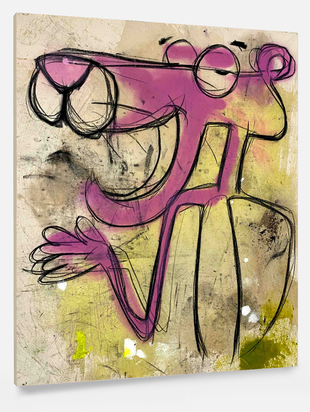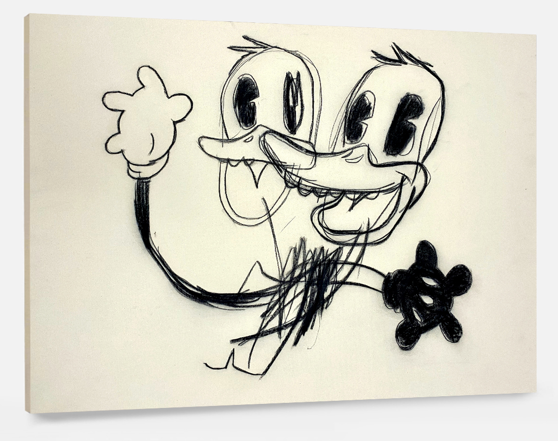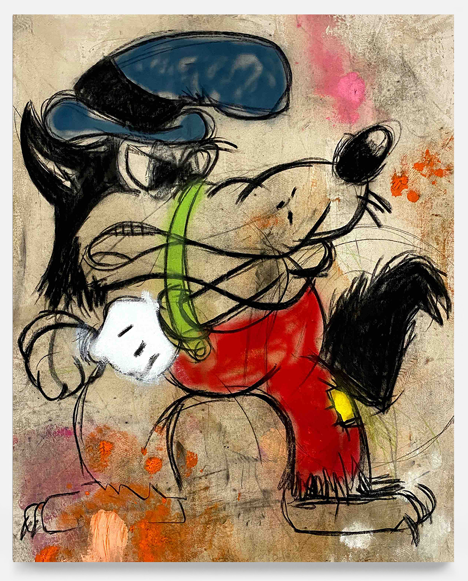 Passionate about animation and drawing, he began to study animation at Surrey Institute of Art and Design. He soon realised that the traditional manner of creating cartoons was shifting towards the digital medium, and decided to study fine arts instead. The result is unparalleled: with his cartoon characters that resemble sketches of cartoon drawings, George Morton-Clark provokes a range of emotions and suddenly thrusts us back into childhood. Here, Garfield, Pluto, and the Pink Panther are depicted with the same features as in the cartoons, but they have a new vitality.