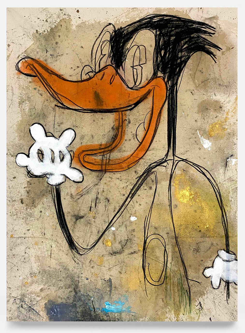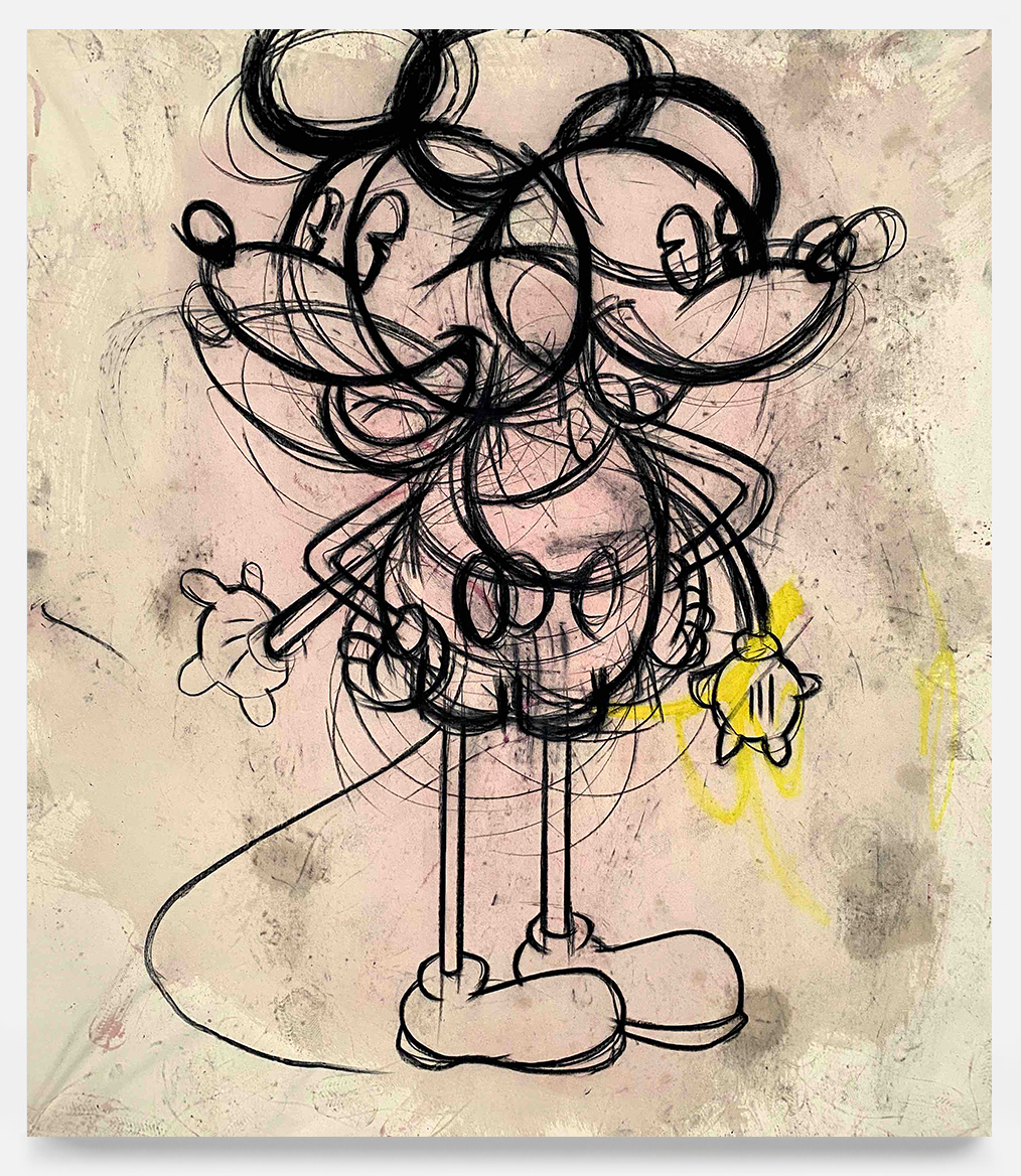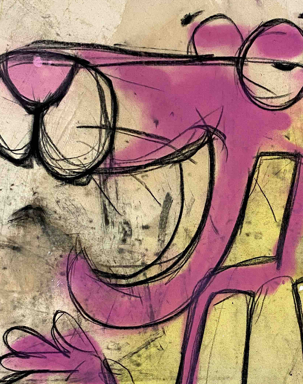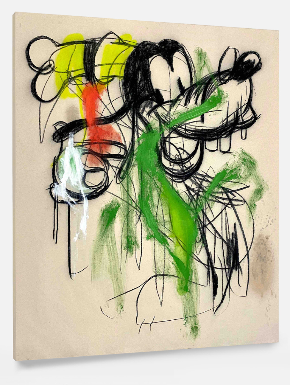 Passionate about animation and drawing, he began to study animation at Surrey Institute of Art and Design. He soon realised that the traditional manner of creating cartoons was shifting towards the digital medium, and decided to study fine arts instead. The result is unparalleled: with his cartoon characters that resemble sketches of cartoon drawings, George Morton-Clark provokes a range of emotions and suddenly thrusts us back into childhood. Here, Garfield, Pluto, and the Pink Panther are depicted with the same features as in the cartoons, but they have a new vitality.